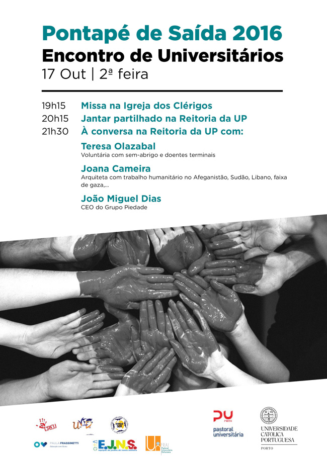 17.10.2016 20:30 Pontapé de Saída 2016 – Encontro de Universitários organizados pela Pastoral Universitária da Diocese do Porto Link: https:///pt/central-eventos/pontape-saida-2016-encontro-universitarios-organizados-pela-pastoral-universitaria