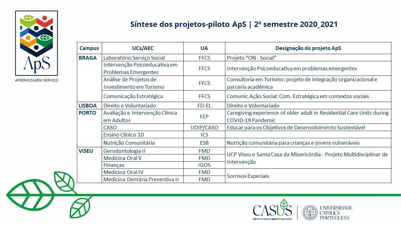 O Projeto CApS – Universidade Católica e Aprendizagem-Serviço: Inovação e Responsabilidade Social - com duração de 3 anos, liderado pela Faculdade de Educação e Psicologia em parceria com a UDIP – Unidade para o Desenvolvimento Integral da Pessoa, da UCP no Porto, tem como objetivo consolidar e validar esta metodologia de ensino em áreas curriculares específicas e transversais dentro da UCP e criar linhas orientadoras para outras IES que queiram seguir os mesmos passos. É o primeiro projeto nacional que envolve os quatro campi da universidade (Sede-Lisboa, Braga, Porto e Viseu), potenciando a coesão interna e o foco comum num ensino diferenciador ao contribuir para a formação de alunos comprometidos com o futuro e com os Objetivos de Desenvolvimento Sustentável (ODS), sensíveis aos problemas dos mais vulneráveis e capazes de liderar mudanças.
