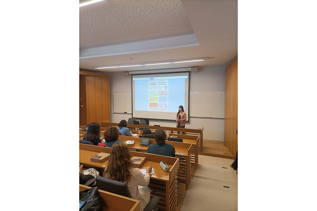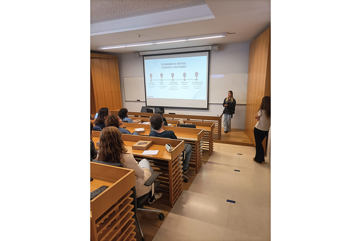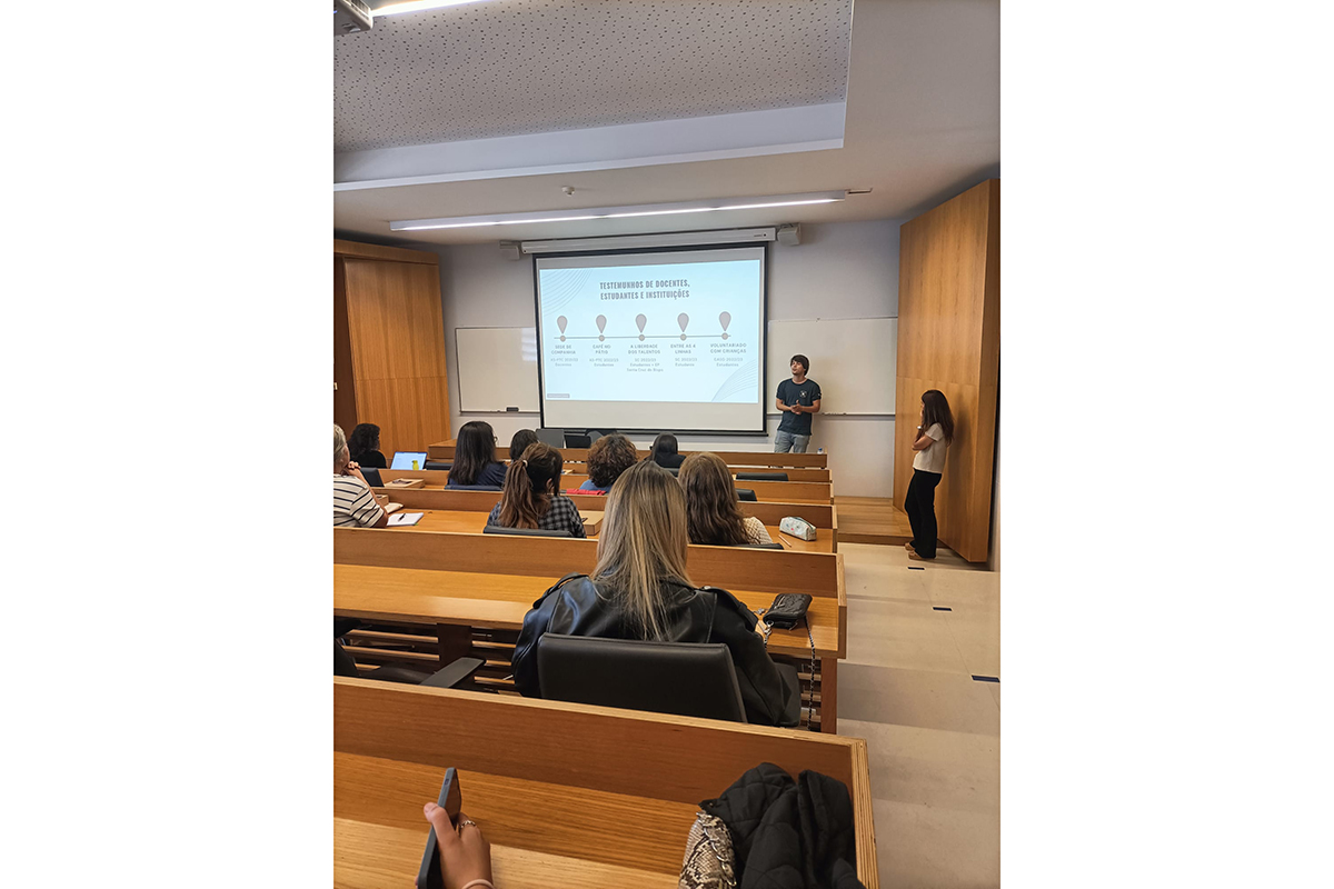 Os testemunhos foram partilhados por Luísa Mota Ribeiro e Helena Gil da Costa, ambas docentes da Faculdade de Educação e Psicologia, que apresentaram a metodologia Aprendizagem Serviço, e por três estudantes de Psicologia que partilharam as suas experiências em diferentes contextos sociais. Mariana Craveiro sobre o projeto do Serviço Comunitário no Estabelecimento Prisional de Santa Cruz do Bispo, Diogo Costa sobre o projeto do Serviço Comunitário na Associação dos Familiares, Utentes e Amigos do Hospital Magalhães Lemos e Maria Silva sobre a sua experiência enquanto voluntária da área SER + Exemplo lúdico na Obra Diocesana de Promoção Social da Fonte da Moura.